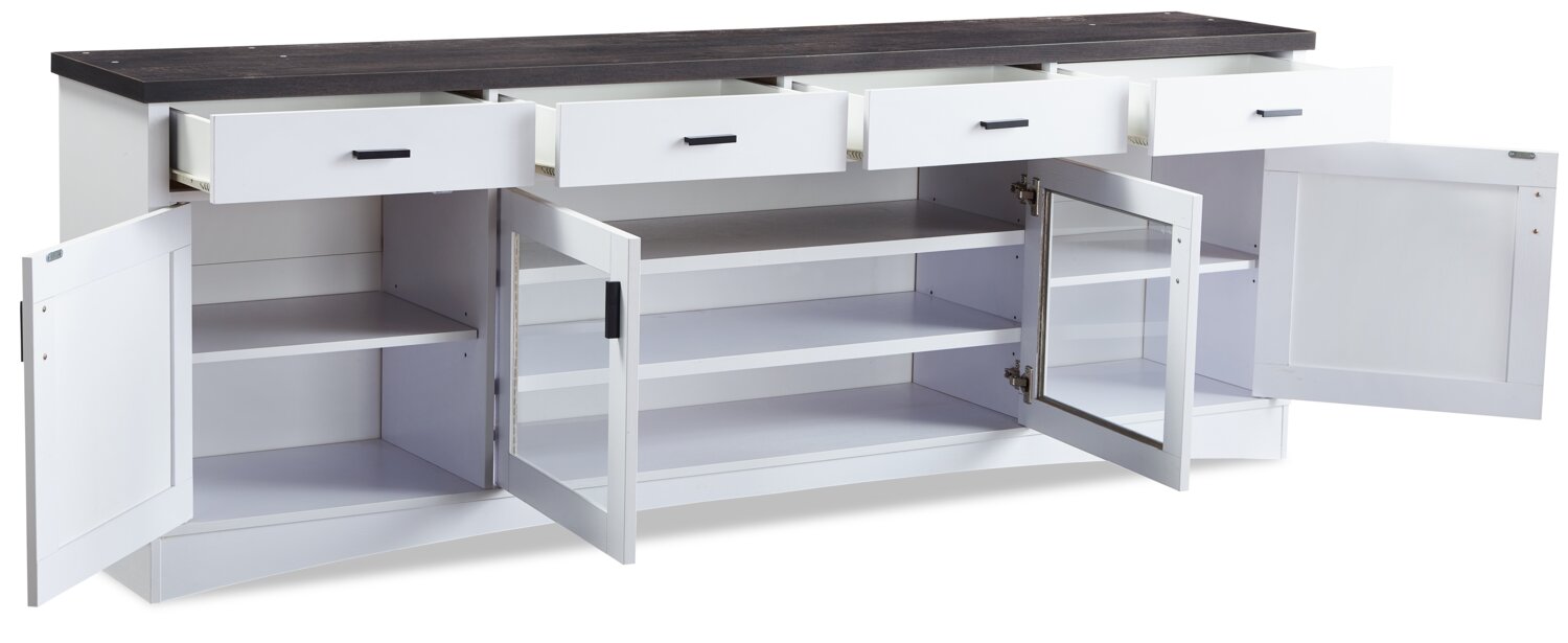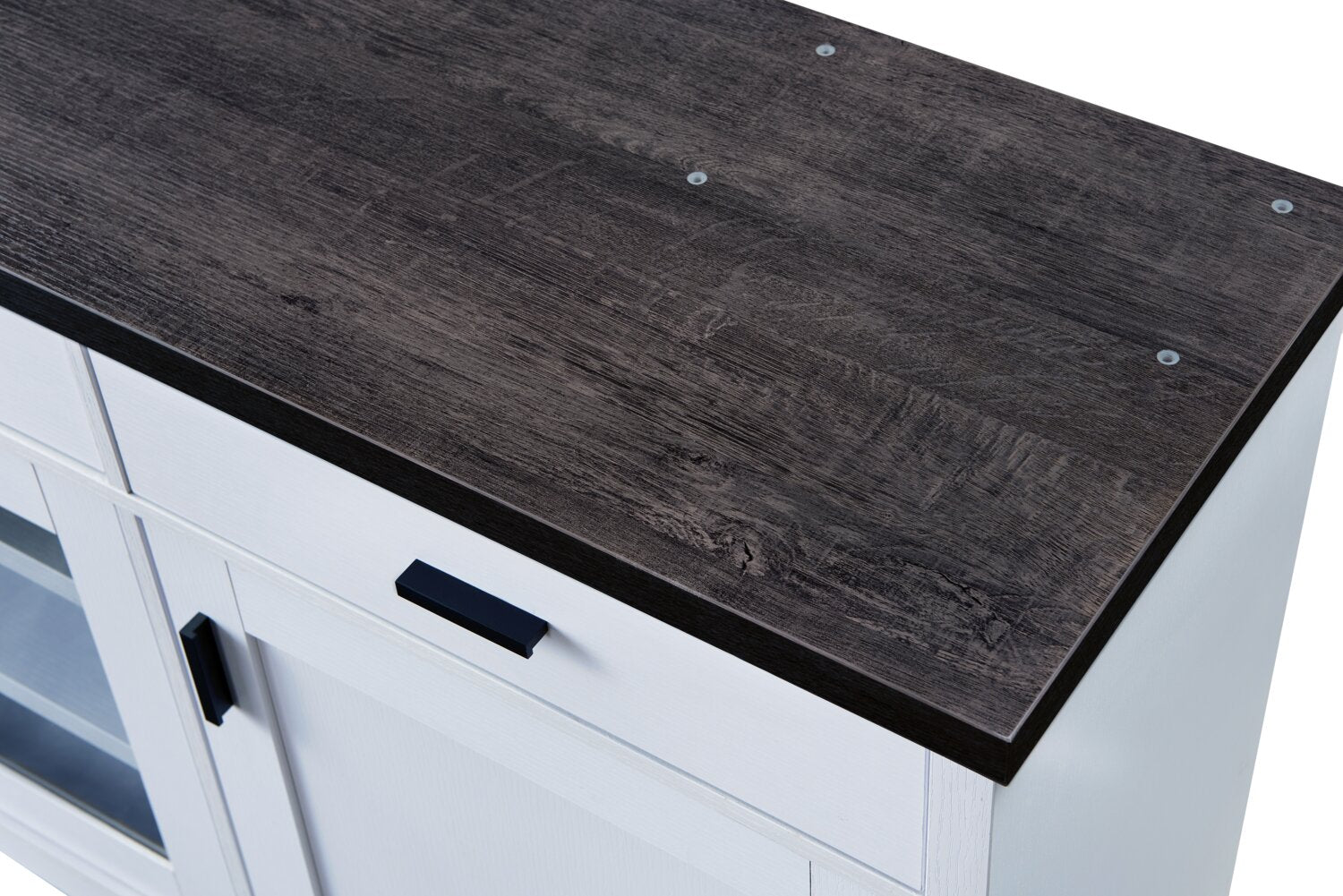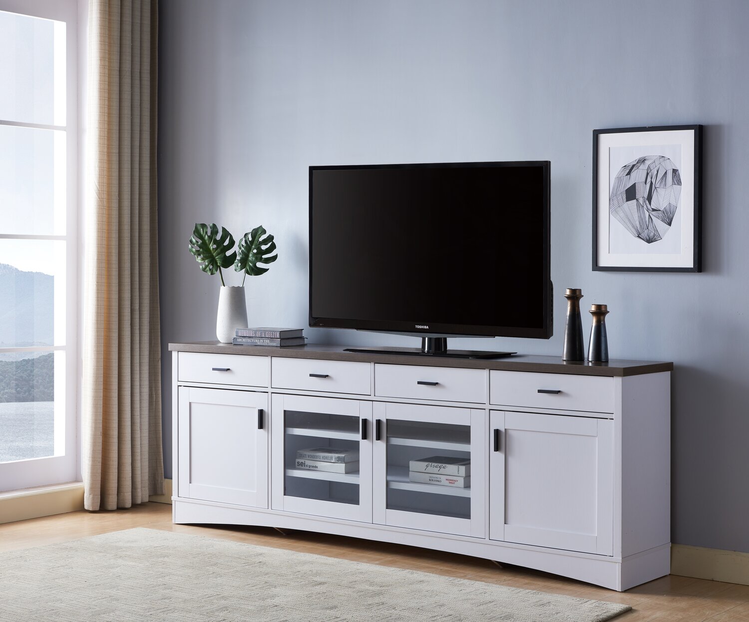 Establish a bright and charming display with plenty of storage space thanks to this country cottage-inspired Emry TV stand. Your media consoles will slide nicely into the two wide shelves in the centre cabinet, while two more cabinets provide plenty of room for books, electronics and household knickknacks. Got more stuff? With four deep drawers providing ample space for power cords, remote controls and batteries, everything has its own place. Capped off with a thick, brown wood tabletop, you'll enjoy the sunny presentation this Emry TV stand brings.