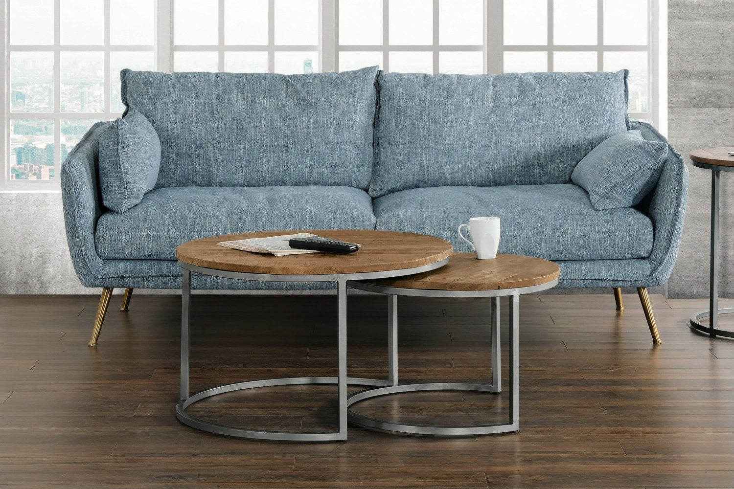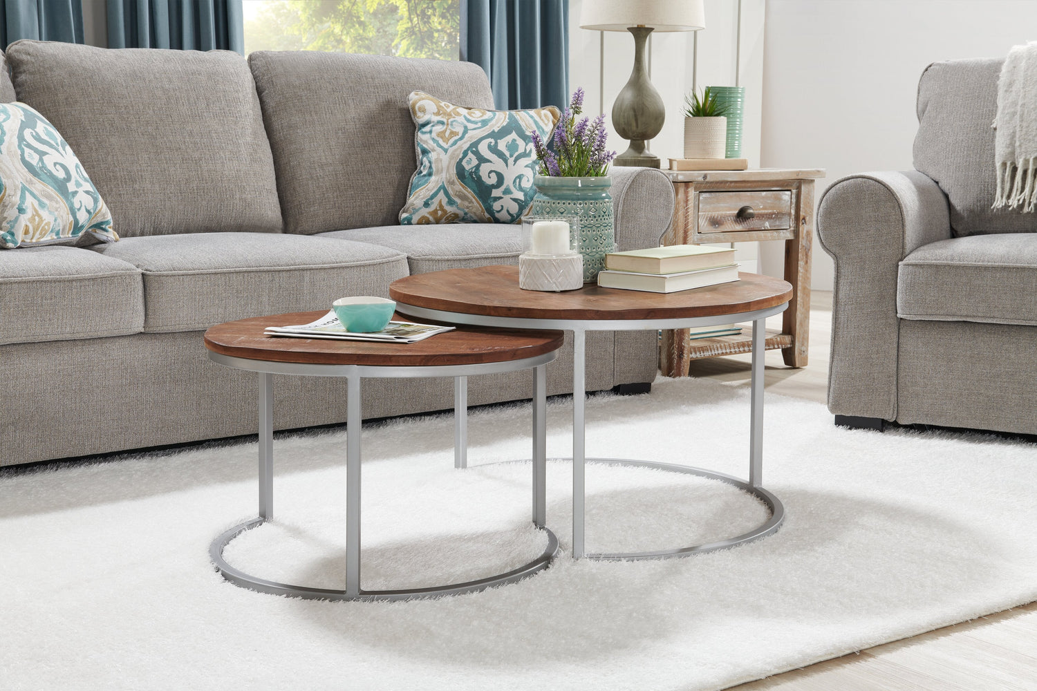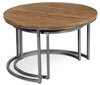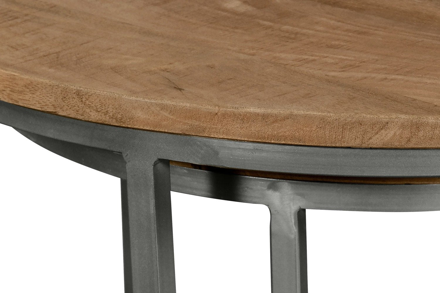 Rustic style comes full circle with this Veranasi nesting table. The tabletop discs are made of solid ironwood, a wood produced from slow-growing trees with a close grain and extra-hard timber. Below, the crescent iron legs are a study in elegance, diverting extra attention to the beautiful washed finish of the wood above. Space out these two tables for an intriguing, staggered coffee table, or tuck one under the other whenever you want extra room around the sofa.