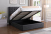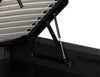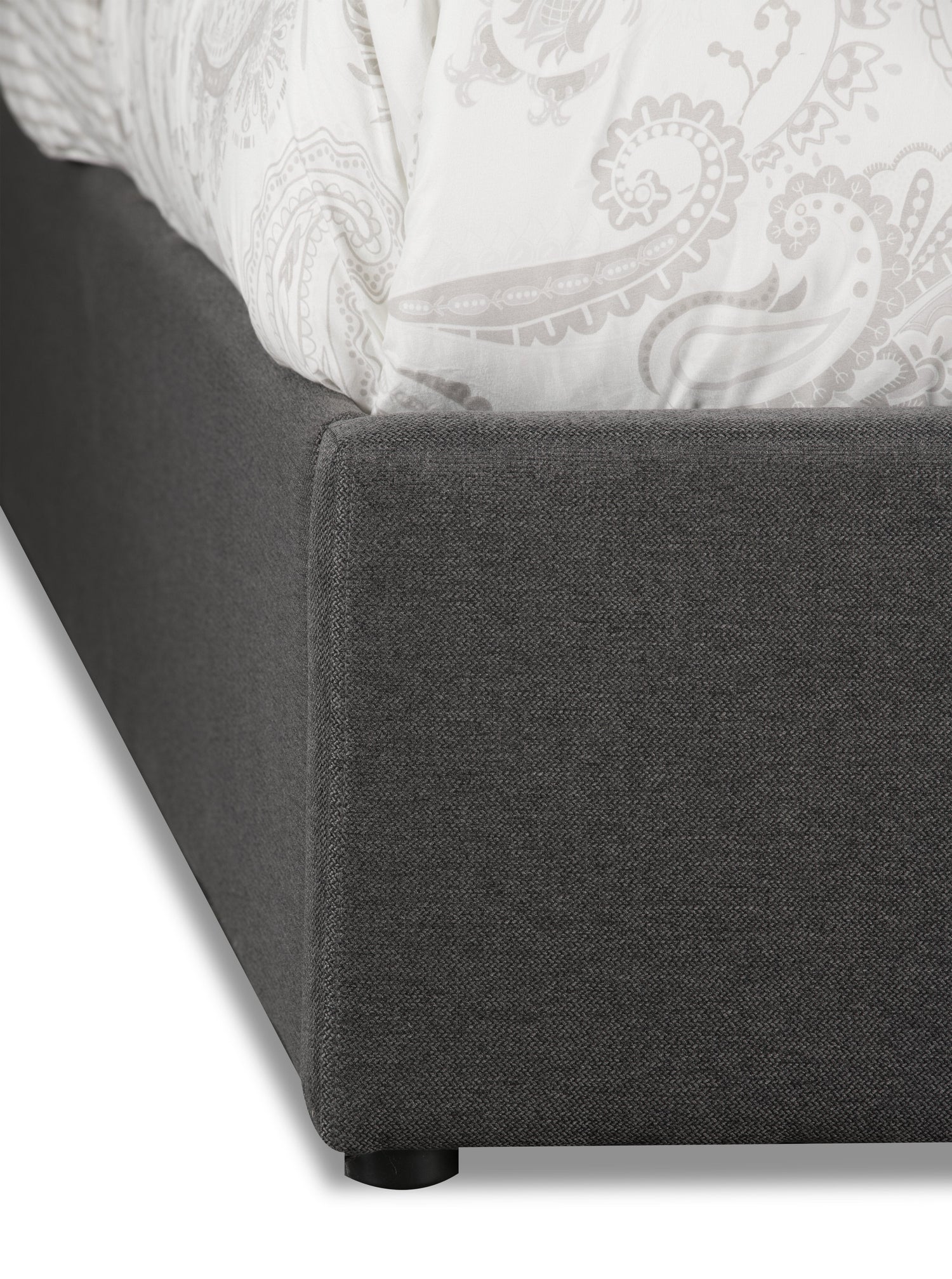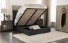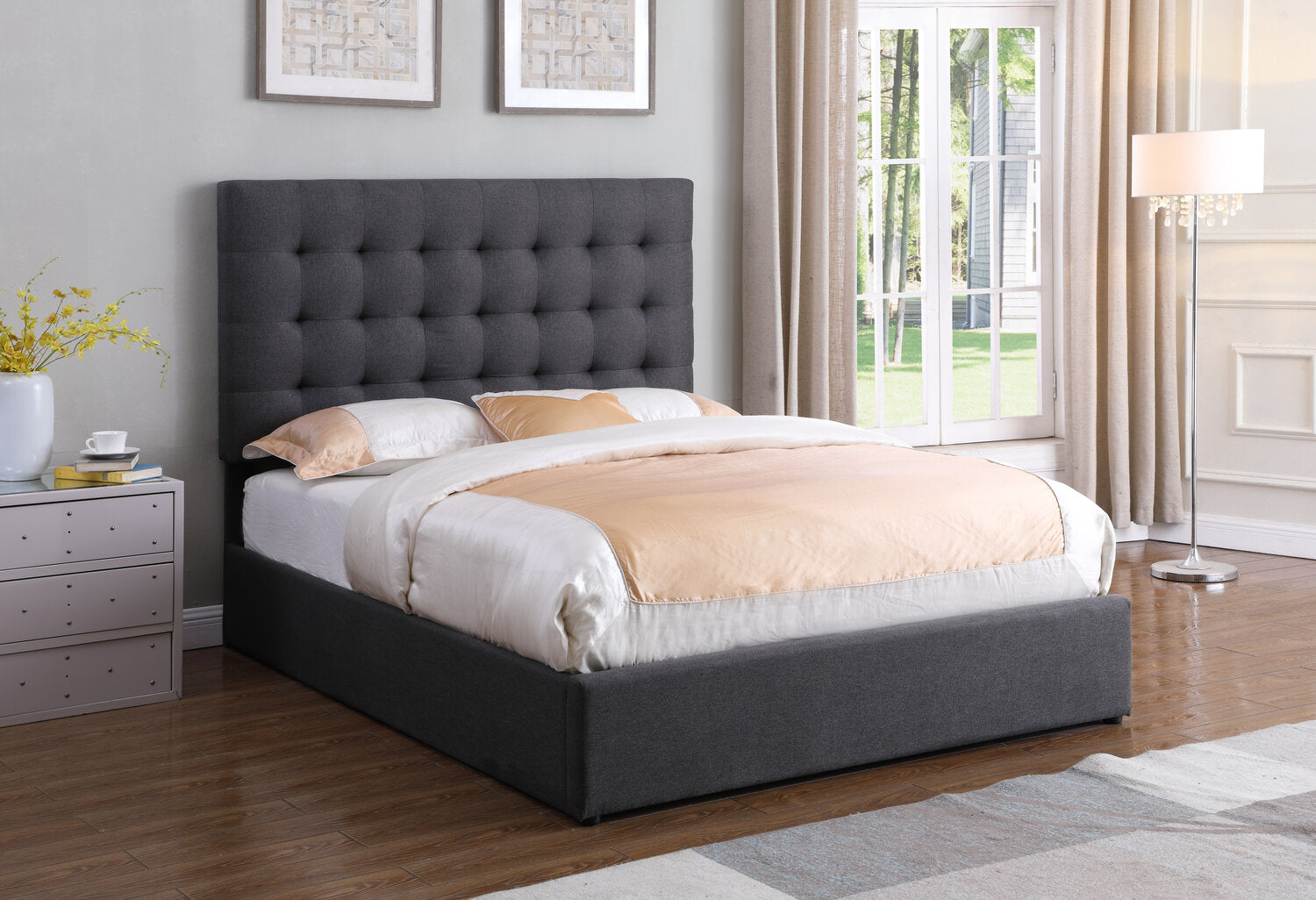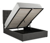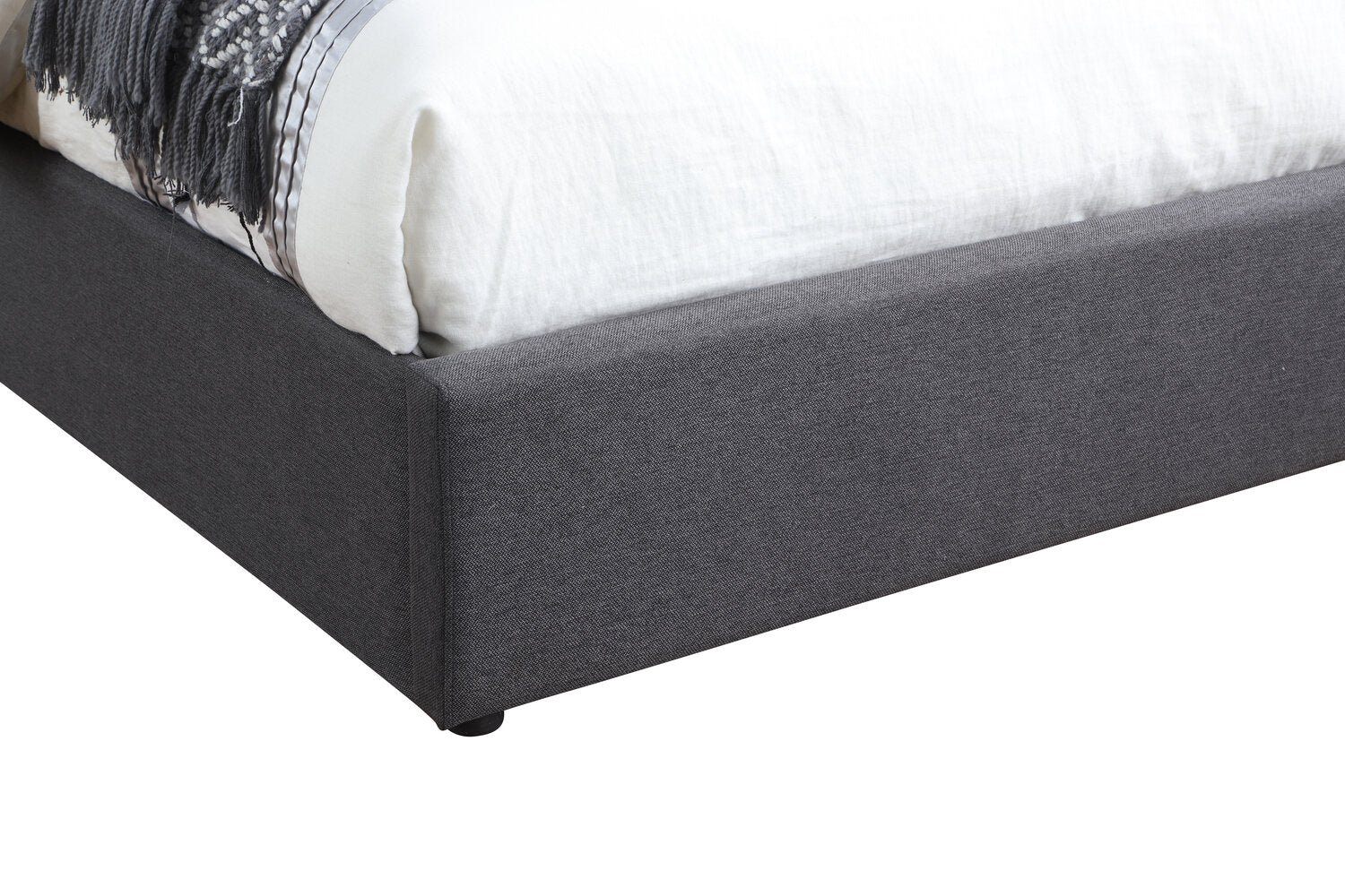 Create a captivating space for sleep by adding this glamorous and functional Jace queen-size storage platform bed. Dark grey linen-look fabric wraps around the headboard and carries down the sides to the footboard, providing a neutral base to build your bedroom's style on. Deep-set button-tufting on the headboard highlights its extravagant height, which you can adjust to suit your needs. Plus, you can lean against the board's foam padding while you read yourself to sleepy time. If you're short on storage, lift the mattress using the hydraulic system to keep seasonal clothes or blankets on hand.
