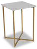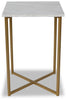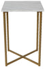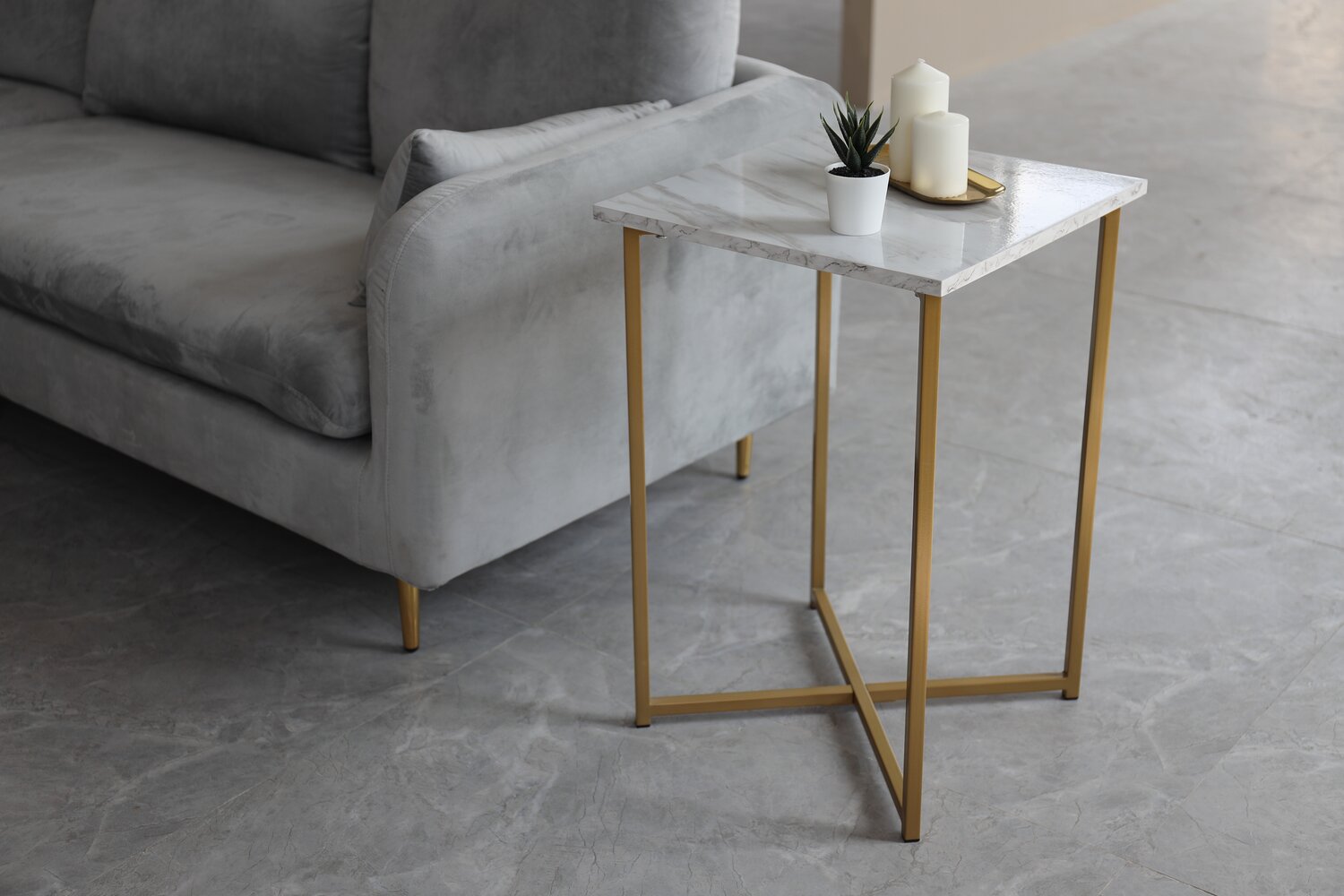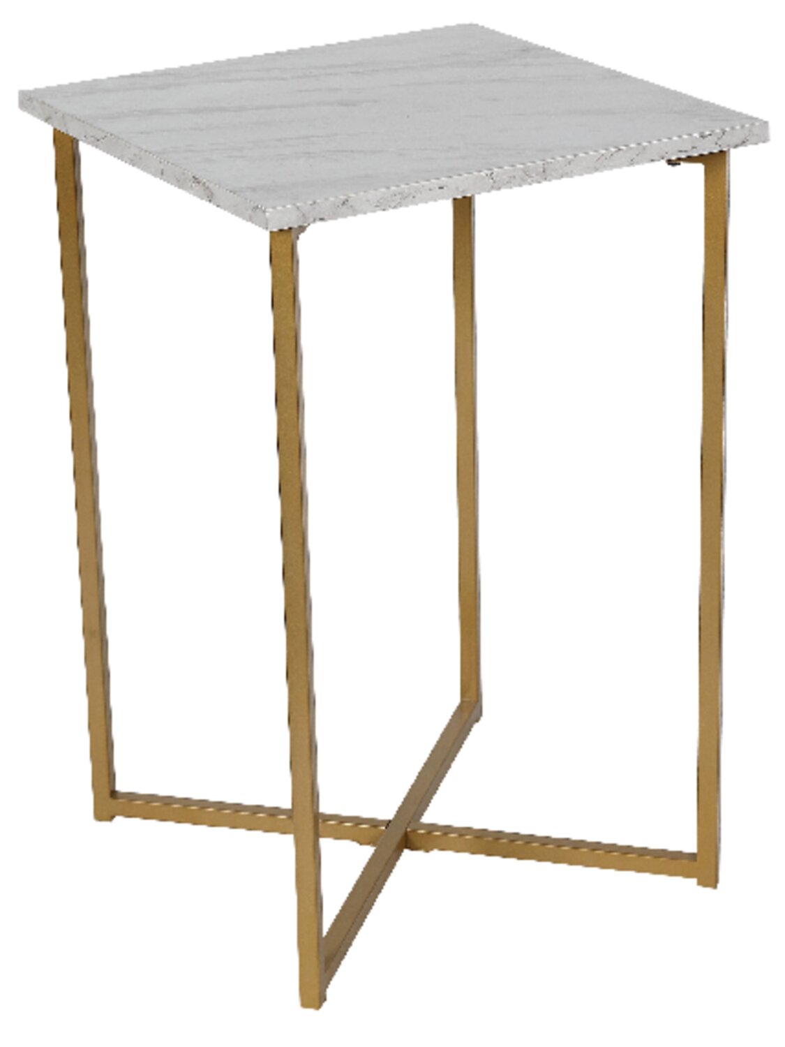 Beauty and elegance are qualities that imbue this Mia chairside table. With a tabletop built of white faux-marble, this is a piece that will add a hint of glamour to any home accessory item that’s placed upon it. Its metal, gold-painted base is both complementary with the glistening white top and eye-catching in design. This table will be a stunning addition to your living space.